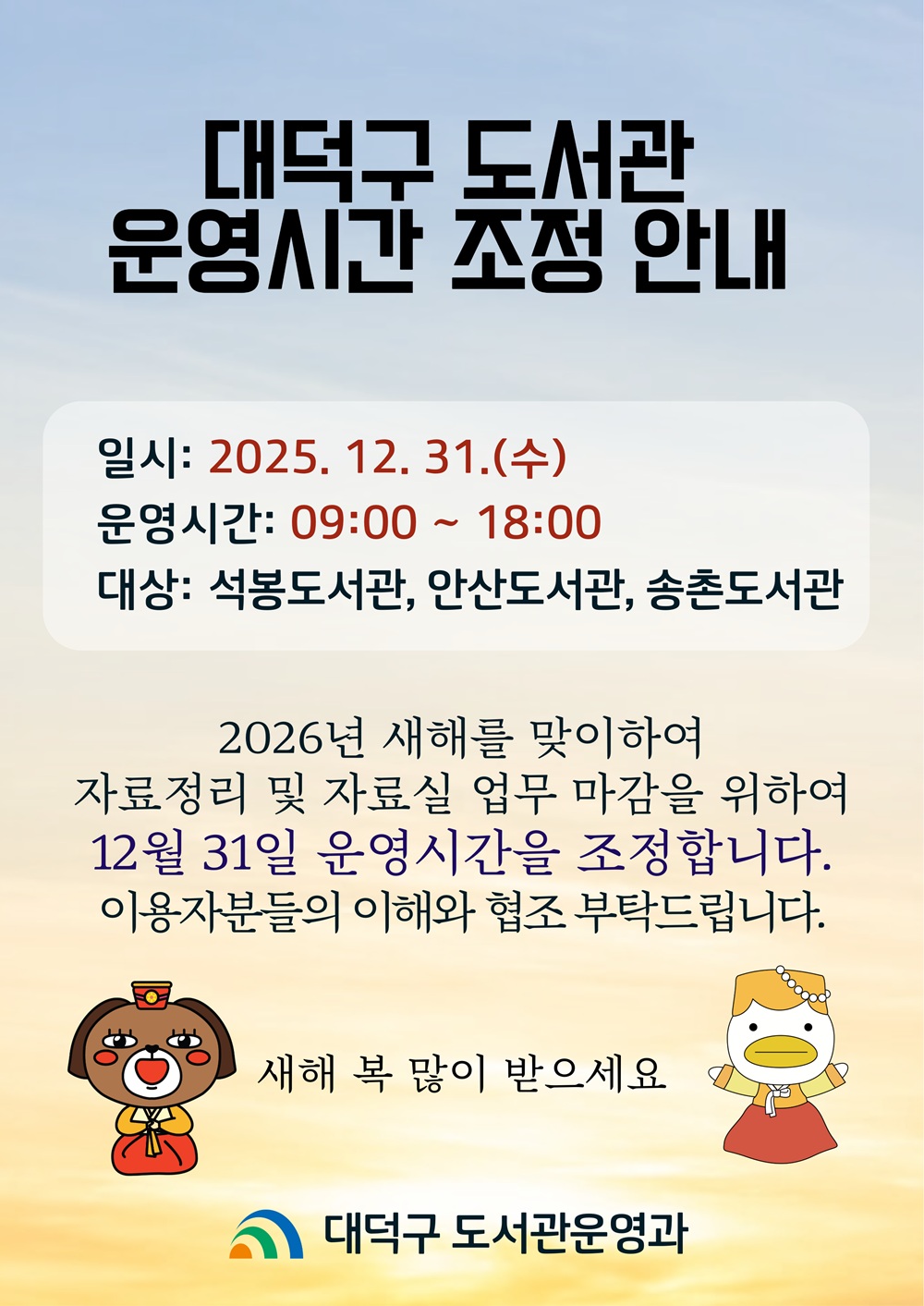 Home 참여광장 공지사항 공지사항 이 게시물은 비공개 입니다. 게시물 등록시 사용했던 비밀번호를 입력하세요. 확인 닫기 공지사항 상세화면 - 제목,작성자,등록일,조회수,첨부파일을 제공하는 표 제목 대덕구 도서관 12월 31일 운영시간 조정 안내 작성자 석봉도서관 등록일 2025-12-24 조회수 176 첨부파일 목록